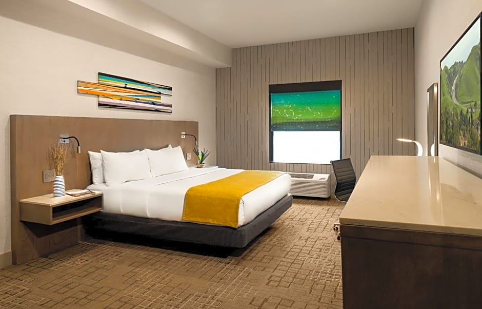 Sun-soaked days can start at the outdoor pool, a refreshing retreat after a day of exploring the area. The on-site dining option, The Winner’s Circle Lounge, serves American fare to pair with a drink from the bar, while the terrace offers mountain-view moments at golden hour.